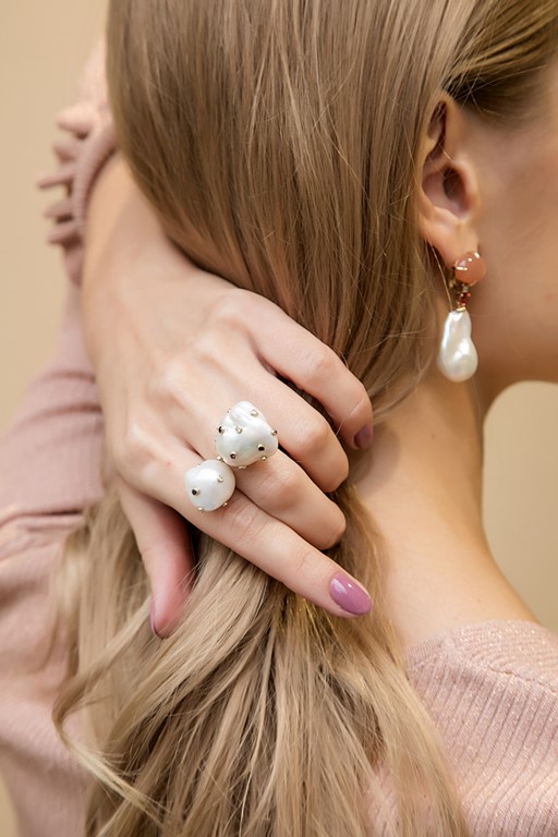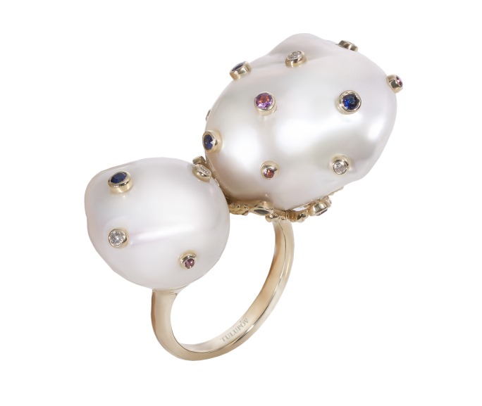 Кольцо с барочным жемчугом, австралийскими опалами, сапфирами и бриллиантами.