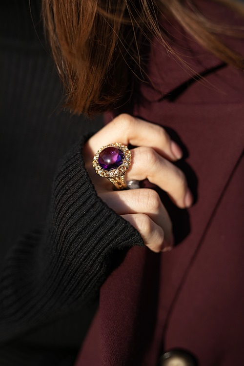 Характеристики вставок: 1 Аметист 7,43, 2 Топаз 1,995, 20 Бриллиант Кр 57 0,135 3/5А.
