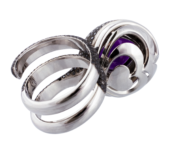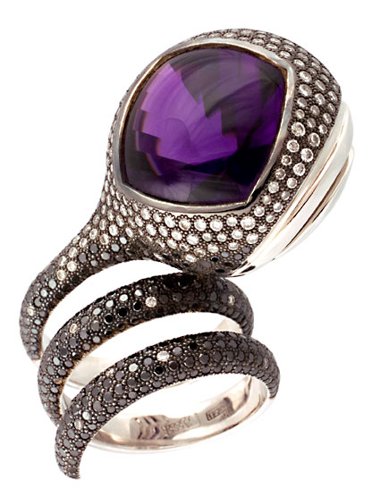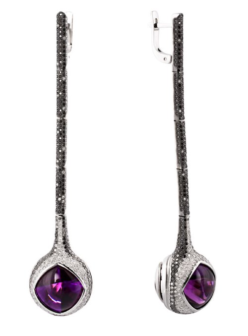 Характеристики вставок: 1 Аметист Кабошон 11.470, 24 Рубин 2/Г-2 0.225, 32 Бриллиант Кр57 0.16 3/4А , 84 Сапфир 0.381 2/Г-2.