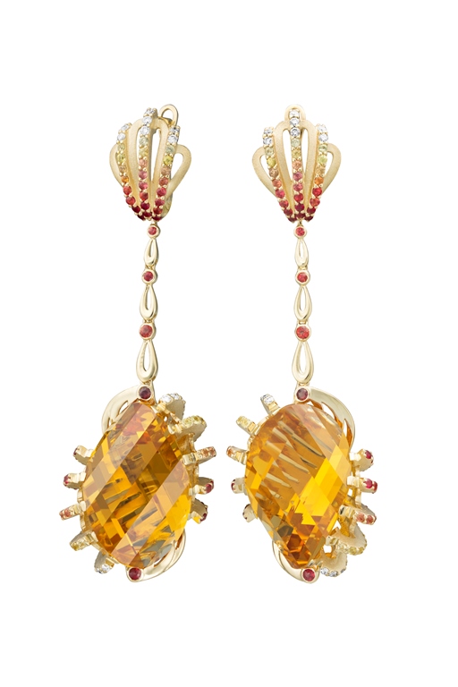 Характеристики вставок: 1 Цитрин 35,250, 10 Сапфир Круг 0,700 3/Г2, 14 Хризолит 5,91, 38 Бриллиант Кр 57 0,54 3/5А.