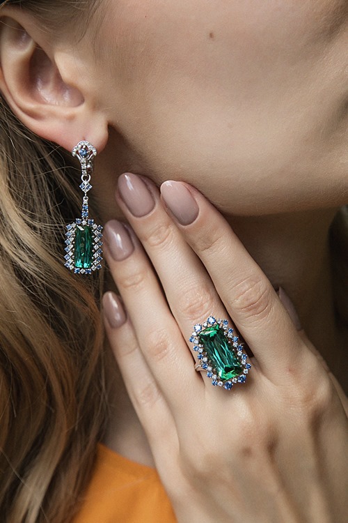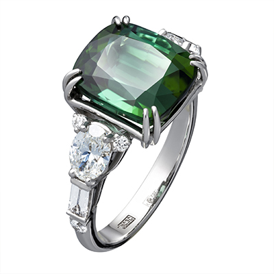 Характеристики вставок: 1 Турмалин зеленый, белые и черные бриллианты.