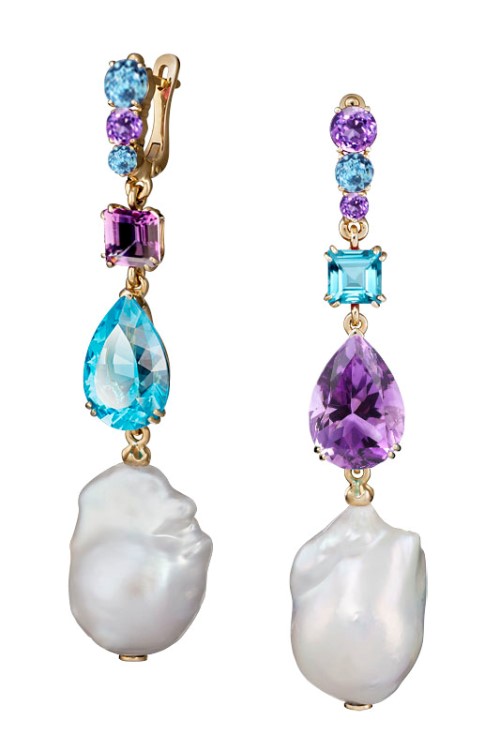 Серьги с аметистами, жемчугом, родолитами и бриллиантами.