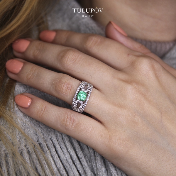 Характеристики вставок: 2 Изумруд Октагон 3,165 4/2, 2 Аквамарин 2,950, 4 Бриллиант Багет 0,825 3/4, 12 Бриллиант Кр 57 0,355 3/5А.