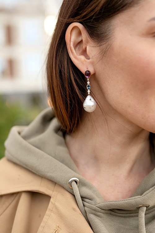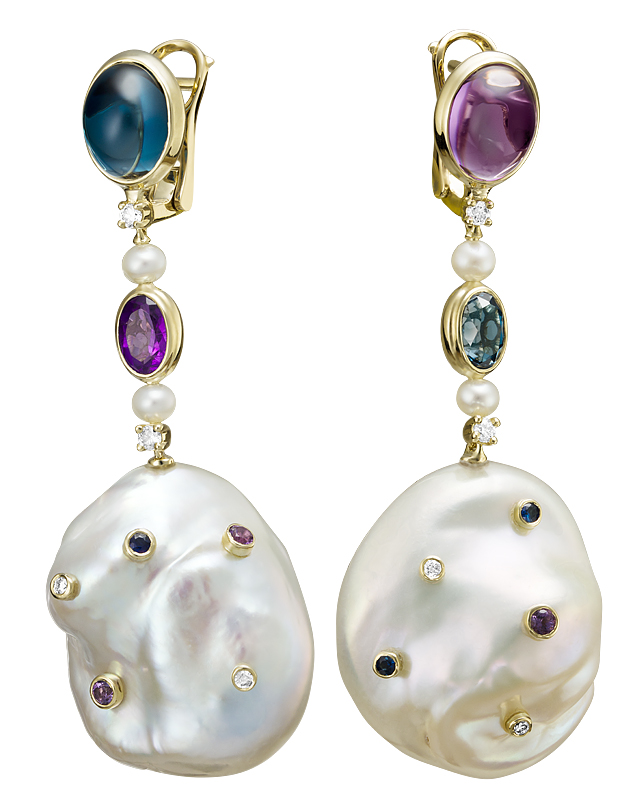 Серьги с аметистами, изумрудами, лейкосапфирами и бриллиантами.