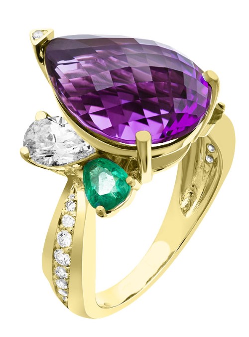 Характеристики вставок: 2 Аметист 11,40, 2 Лейкосапфир 1,39, 2 Изумруд Груша 0,340 3/Г3, 2 Изумруд Груша 0,690 3/Г3, 2 Бриллиант Кр 57 0,008 3/5А.