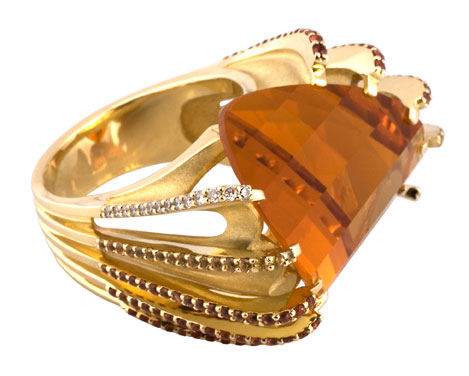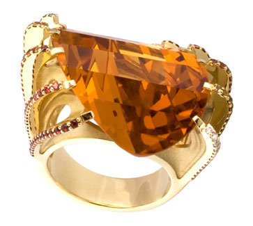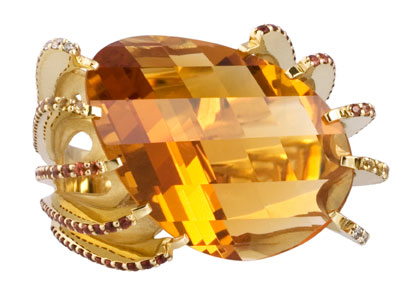 Характеристики вставок: 2 Цитрин 10,435, 60 Сапфир оранжевый 0,22, 78 Бриллиант Кр 57 0,400 4/4А.